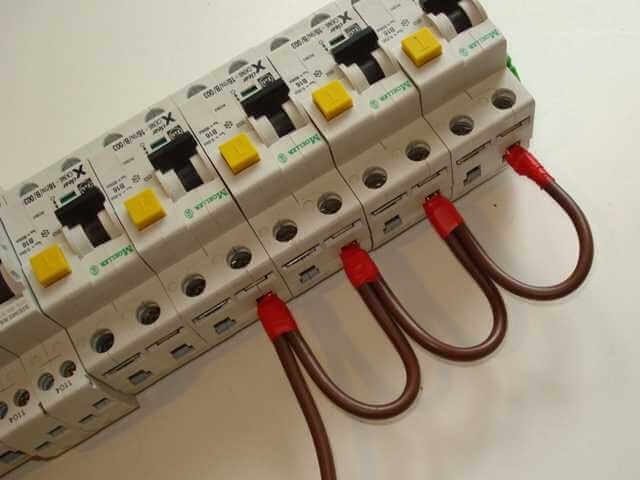 Все соединения с автоматом осуществляются с помощью перемычек. Для этой цели может применяться однопроволочный жесткий провод. По возможности лучше не использовать перемычки, а делать все через соединительную жилу. Благодаря ей контакт будет надежный, а внешний вид эстетичный.