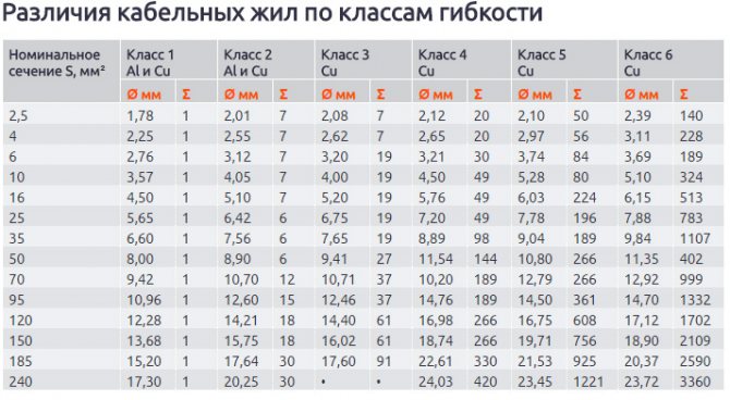 Все проводники можно разделить на классы по гибкости. Этот показатель зависит от конструкции жил. Чем класс выше, тем более гибкий проводник. Монолитные жилы сложно гнутся и могут сломаться в процессе эксплуатации, но их легко подсоединять к клеммам. Многопроволочные изделия лучше гнутся, с ними проще работать, но сложность заключается в невозможности подсоединения к клеммам и винтовым зажимам. Для этого приходится либо лудить концы, либо обжимать их специальными наконечниками. В ином случае контакт будет ненадежным и прослужит недолго. Выбор многожильного или одножильного провода также зависит от класса гибкости изделия.