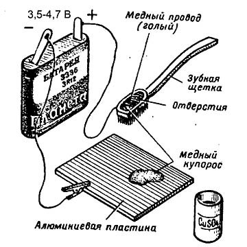 Есть еще «пионерский» способ пайки алюминия с предварительным омеднением. Он пригоден, когда требуется только электрический контакт, а механические напряжения в зоне пайки исключены, напр., если нужно соединить алюминиевый кожух с общей шиной печатной платы. «По-пионерски» пайка алюминия осуществляется на установке, показанной на рис. слева. Порошок медного купороса насыпают горкой в зону пайки. Зубную щетку пожестче, обмотанную голым медным проводом, окунают в дистиллированную воду и растирают ею с нажимом купорос. Когда на алюминии появится медное пятно, его лудят и паяют как обычно.