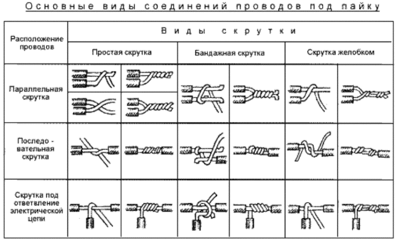 Прежде чем паять провода, их нужно правильно скрутить. Основные виды скруток проводов для пайки показаны на рис. У каждого из них свое предназначение: