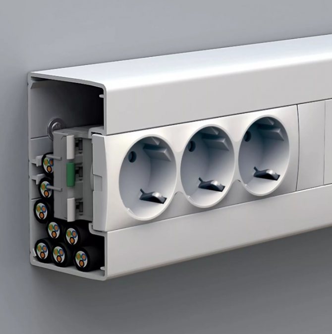 Такие системы стоят намного дороже простых кабель-каналов, зато устанавливать их намного проще, проще подключать к «скользящим» электроточкам, коими являются комплектные розетки и выключатели. Все система в себя включает следующее: