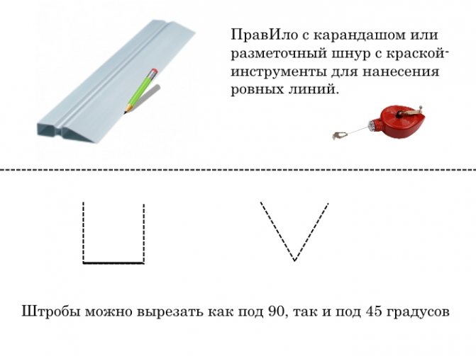 Для начала при помощи разбивочного шнура с краской или прави́ла и карандаша разметим линии, по которым необходимо выштробить борозды. Желательно, чтобы линии были максимально прямыми.