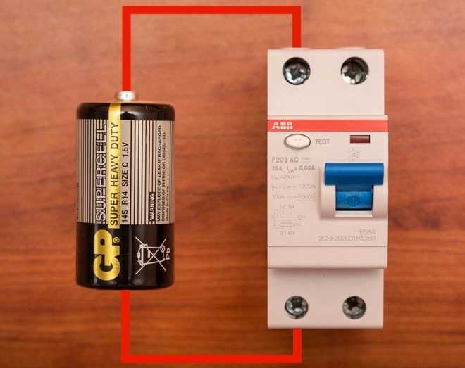 А для приборов с характеристикой АС батарейку подключают одной полярностью, если устройство не сработает нужно поменять полярность батарейки (минус к выходу прибора, а плюс ко входу). Таким способом проверяются только электромеханические УЗО.