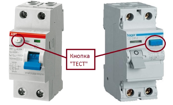 Эта кнопка расположена на лицевой стороне дифференциального автомата. Перед проверкой работоспособности устройства его подключают к сети. При нажатии на кнопку «ТЕСТ» защита отключает сеть. Кнопка «ТЕСТ» имитирует ток утечки, как при нарушении целостности изоляции проводов.