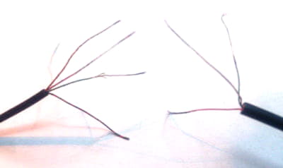 Лак и капрон оставляют небольшой нагар, который в легко счищается ногтем. В итоге мы имеем очищенные от лака неповрежденные проводки.