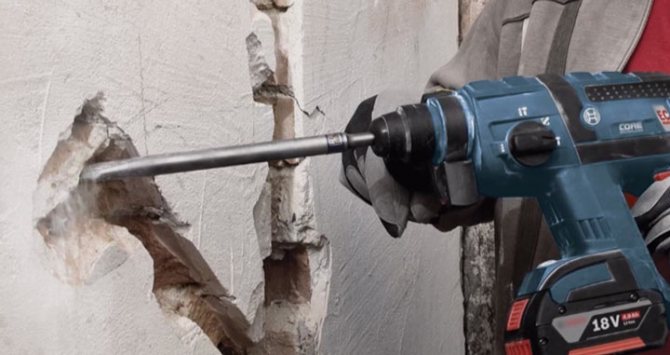 - Перфоратор со специальной насадкой. Выполняются работы в твердом объеме, армированном бетоне и кирпиче. Окончательный результат среднего качества: края канавок неровные, со сколами, требуется дополнительная доработка. Недостаток инструмента – издает высокий уровень шума более 100 дБ.