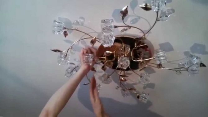 Эти элементы тщательно монтируются, чтобы они надёжно находились на люстре и не болтались в разные стороны, поскольку это затруднит эксплуатацию и процесс закрепления на потолок.