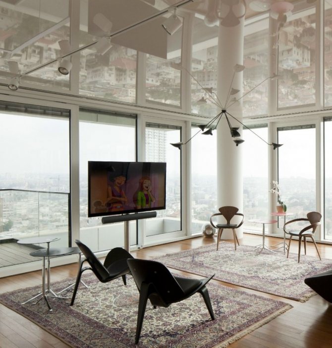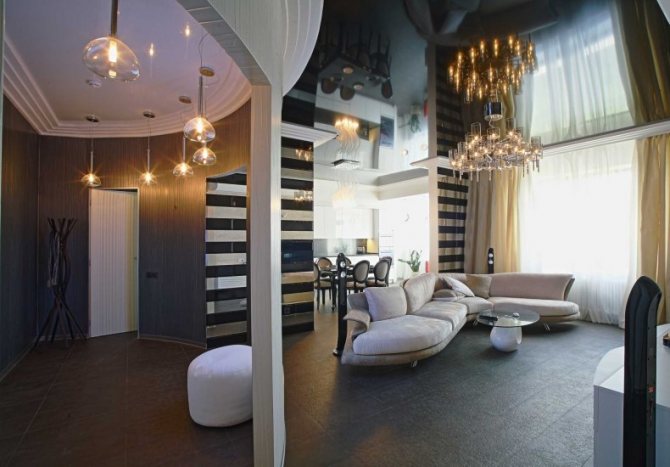 Сочетание элементов декора и мебели в самых различных стилях дает простор для фантазии. Люстра в такое помещение подбирается оригинальная и достаточно броская. Здесь выбор очень широк – от бронзы и позолоты до стекла и керамики, все зависит от дизайнерской задумки.