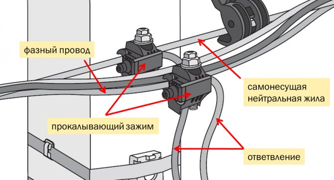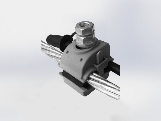 Прокладываемые в доме жилы медного кабеля ВВГ соединяются с проводами СИП посредством прокалывающих зажимов. Такие проколы гарантируют надёжное электрическое соединение, исключающее необходимость в удалении изоляции.