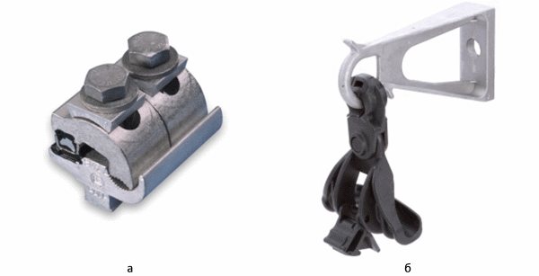 Для несущего провода СИП-2 такой зажим может выполняться в виде отдельной зажимной плашки (смотрите рисунок «а» ниже), а для СИП-4 используются специальные приспособления с одновременным захватом всех жил (рисунок «б»).