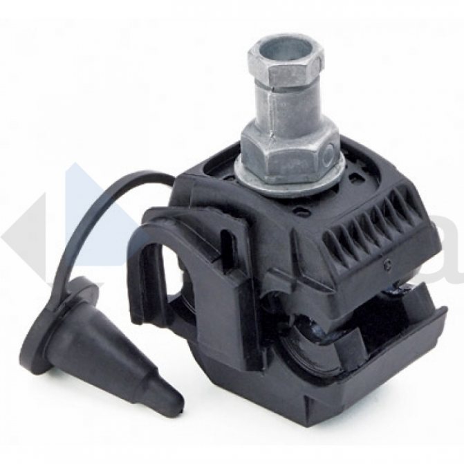 Соединение линии со щитом учета выполняется цельным проводником, который в щите подключается непосредственно к вводному автомату. Чтобы соединить проводник с линией, следует воспользоваться штатным прокалывающим зажимом, специально предназначенным для линий СИП. Вариант исполнения такого соединителя изображен на фото ниже. Прокалывающий зажим предназначен для присоединения отпаек к магистральным линиям. Данный экземпляр может соединять линию, сечением от 16 мм 2 до 120 мм 2 с отпайкой, имеющей сечение от 6 мм 2 до 50 мм 2 . В качестве отпайки может быть применен СИП, либо обычный медный кабель, например ВВГ.