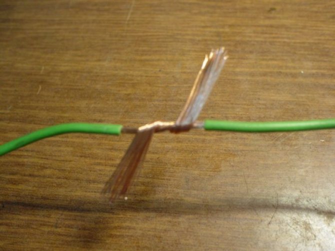 Простейший вариант, когда две зачищенные жилы укладываются крест-на-крест одна на одну. Скручивать допускается только участок без изоляции. Параллельная скрутка обеспечивает надежность контактов, но не защищается от разрывов с усилием.