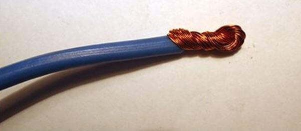 - Скрутив все тонкие жилы в тугой пучок и если позволяет сечение, загнуть его в противоположную сторону. Сделать это можно пассатижами или же руками, всё зависит от сечения токопроводящей жилы. Этот способ самый простой и применяется в современной проводке только в экстренных случаях, но он тоже имеет право на существование. Выполнить данную процедуру с кабелем большого сечения таким способом не получится, поэтому он больше подойдёт для подачи напряжения к вилке, к розетке или к патрону маломощного осветительного прибора.
