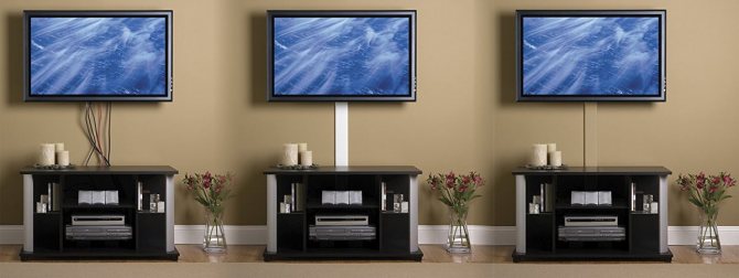 Под телевизором можно разместить навесную панель со встроенным отсеком для проводки, с закрывающейся дверцей. Неплохо под экраном будет смотреться банкетка. Но наиболее распространенным способом спрятать шнур, идущий от телевизора – разместить под ним практичную мебель: тумбу или пенал. Достаточно ее поставить в зоне телевизора и вся проводка будет расположена за шкафами или полками на стене.