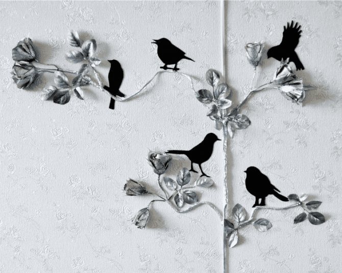 Можно «нарисовать» с помощью провода дерево, а виниловые наклейки будут его листьями, цветками, плинтус сойдёт за почву. Или можно сделать из провода отдельную ветку, рассадив на ней птиц из винила. Усилить эффект помогут гирлянды из светодиодов, разноцветные ленты, перья и т. п.