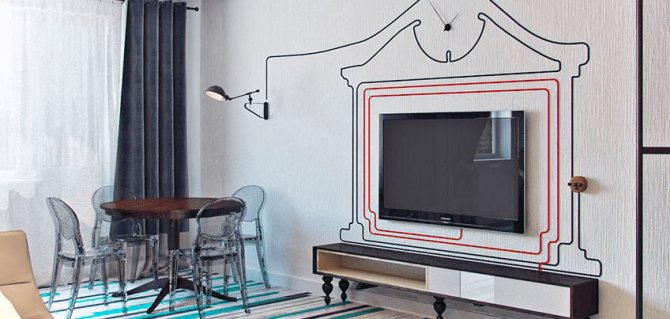 Иногда дизайнеры пользуются нестандартным приемом, когда лучше не маскировать шнуры от телевизора, а оставить их на самом видном месте и при этом выгодно обыграть обстановку. Если позволяет длина – ими на стене формируют графические узоры, собирают целые композиции, гармонично вписывающиеся в общую тематику ремонта. Провода можно «одеть» в разноцветные кожухи, если того требует интерьер. Перед креплением кабелей, необходимо предварительно нанести эскиз карандашом на стену.