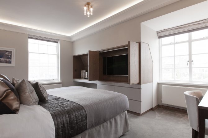 В комнате для отдыха можно провести декорирование цветами, тканью или спрятать тв-панель с проводами в шкаф. Антенну можно включить в композицию с бантами и лентами, а провод спрятать за зеркалом или картиной.