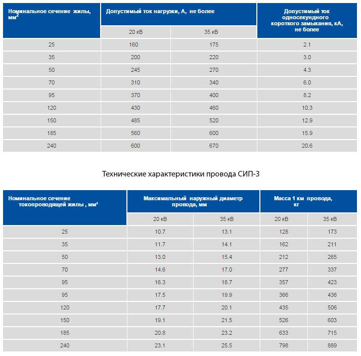 Технические параметры и характеристики (сечение, номинальный ток, ток КЗ, диаметр, масса) высоковольтного провода СИП-3: