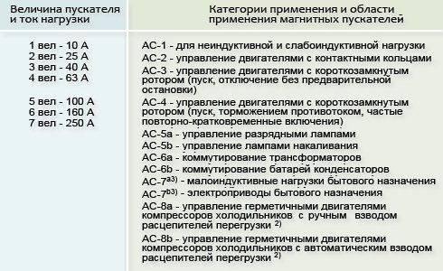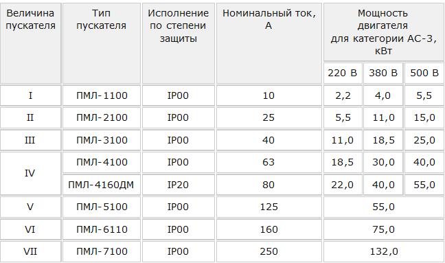 Соответственно полученному значению выбирают пусковое устройство с номинальным током не меньше расчётного ниже по таблице.
