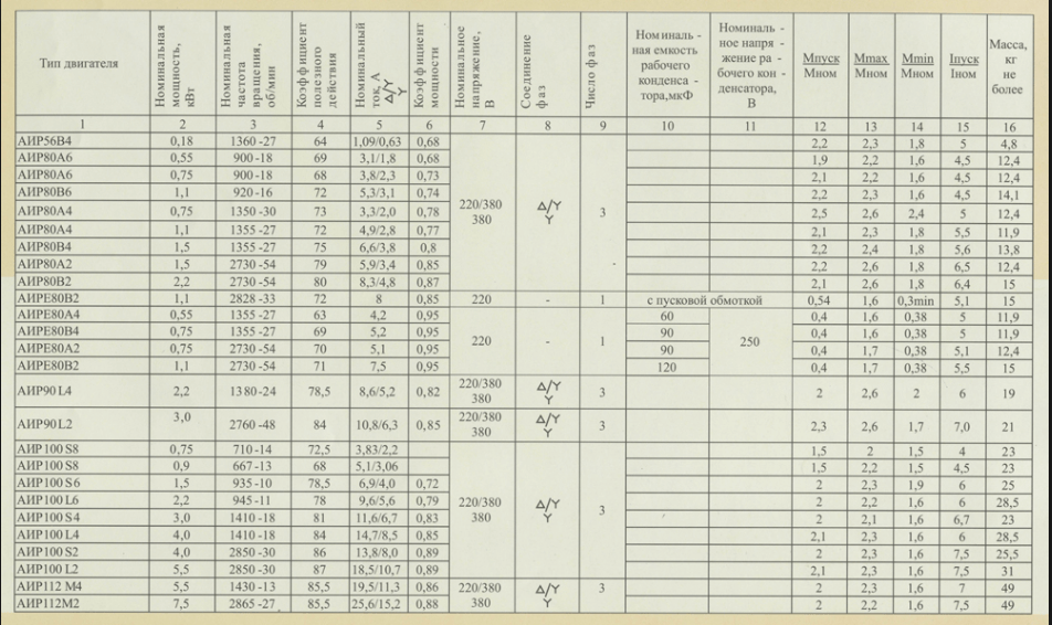 В том случае, когда на таблице частично читаются данные, размещаем таблицу с паспортными данными асинхронных двигателей широко распространенных в народном хозяйстве (тип АИР). С помощью нее возможно определить In.