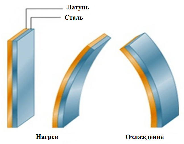 Обеспечивается такое жесткое скрепление путем сваривания или прокаткой в горячем виде. За счет того, что пластина закреплена неподвижно, при нагреве наблюдается ее изгиб в сторону элемента с меньшим температурным коэффициентом. Этот принцип взят за основу при создании тепловых реле.