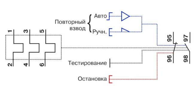 Схема прибора включает кнопки «Тест» и «Стоп» или «Сброс». С помощью первой проверяют работоспособность, а второй — отключают защиту вручную.