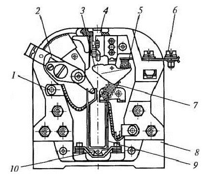 Тепловое реле ТРТ в разрезе. Здесь основными элементами являются: корпус (1), механизм уставки (2), кнопка (3), ось (4), контакты серебряные (5), контактный мостик (6), изоляционная колодка (7), пружина (8), пластина биметаллическая (9), ось (10)