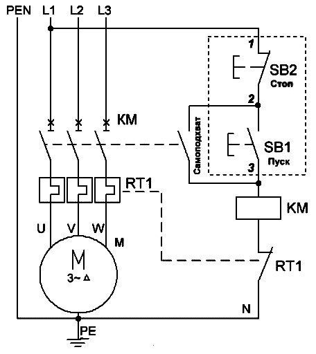 Тепловое реле размещают за контакторами, но перед электродвигателем. Подсоединение контакта normal connectde к кнопке «Стоп» на пульте управления осуществляют по последовательной схеме (+)