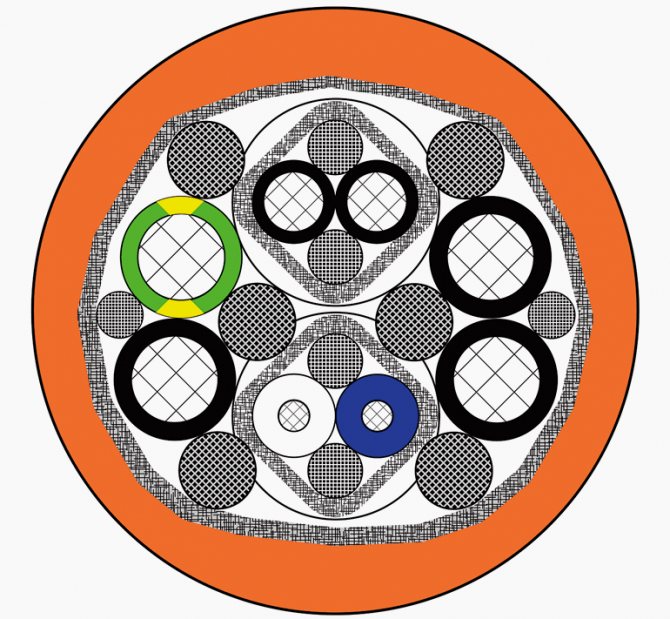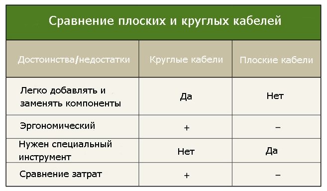 Также удобнее работать с круглым кабелем с заполнителем между жилами. Круглый кабель не перекручивается, и при необходимости его легко заводить через гермовводы, а заполнитель служит дополнительным изолятором и ограничителем притока кислорода, что полезно в случае возгорания.