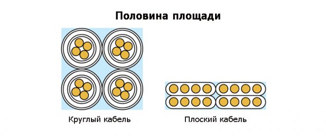 Занимаемая при монтаже площадь и его удобность играет не последнюю роль, и здесь круглые проводники имеют преимущество, так как сделать круглое отверстие значительно проще, чем прямоугольное. Тем не менее, при использовании плоских кабелей появляется возможность уложить их друг на друга для экономии места, что нельзя сделать при использовании круглых.