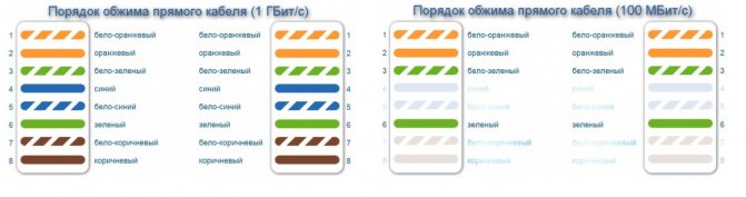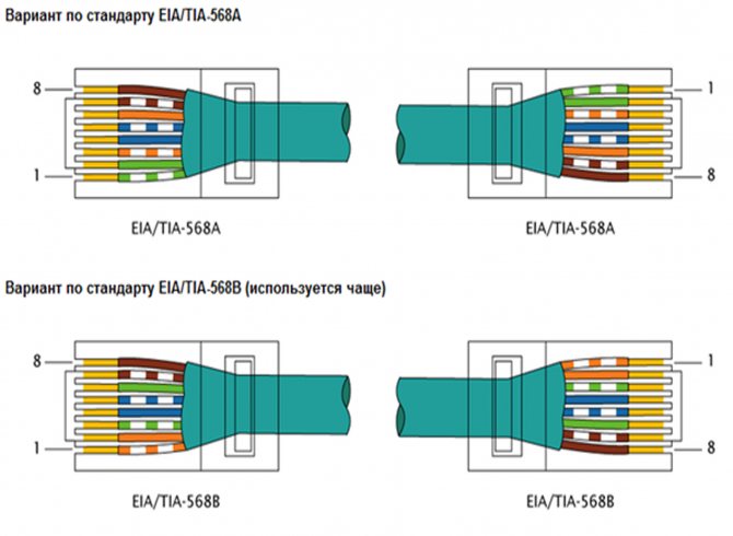Возможно, текстовое описание и лучше, только судя по тексту, во всех вариантах надо соединить первый контакт с первым, второй со вторым, третий с третим и так до восьмого с восьмым. Разница только в цвете проводов. Убейте меня, кто-нибудь. Пойду теперь искать в сети, как кабель обжать, раньше-то приходилось в википедии смотреть. Спасибо за статью.