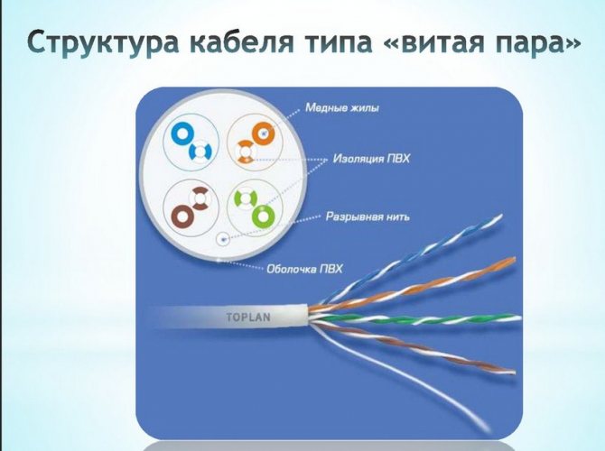 Внутри этого кабеля находятся восемь медных жил, сплетённых (свитых) попарно. Отсюда название — витая пара.