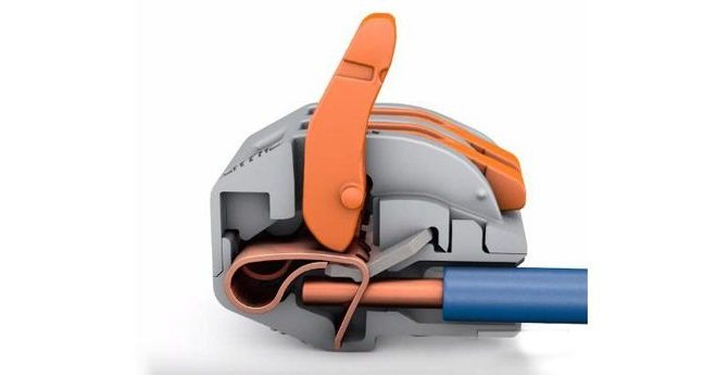 Клеммные колодки с пружинными контактами не имеют указанных выше недостатком. Такие клемы еще называют самозажимными. В пластиковом корпусе установлена пластина из эластичной стали. Эта пластина имеет специальную форму — из нее сделана плоская пружина. Для соединения проводников, их надо просунуть между лепестками пластины. Проводник разжимает два «крыла» пружины, а те, за счет силы упругости, фиксируют его и обеспечивают контакт.