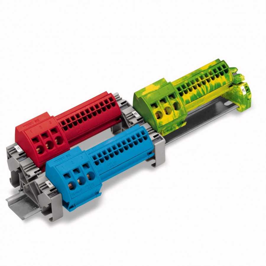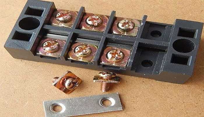 Самая простая колодка — это металлическая рейка с рядом контактных зажимов. Предназначена для объединения множества проводов с одним номиналом. Например, нулевая шина или заземление.