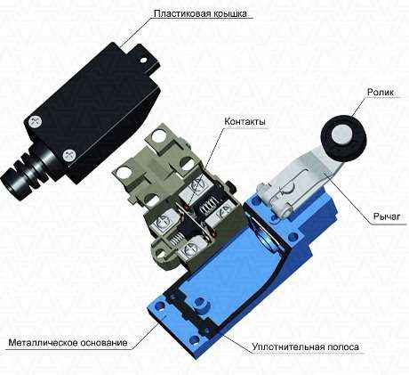 Состоит подобный выключатель из корпуса, в котором имеются электрические контакты (замыкающие или размыкающие). Снаружи ставится ролик либо кнопка, в зависимости от того, как он будет эксплуатироваться.