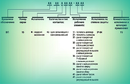 Подробно расшифруем для примера маркировку выключателя ВП 15М4221-54У2. Он оснащен одним подвижным действующим элементом серии 15. Имеет один замыкающий контакт и один размыкающий, оснащенный толкателем с роликом. Уровень защиты — IP54 со стороны привода, «У» обозначает климатическое исполнение, а цифра 2 — категорию размещения. Изделие соответствует ТУ У 31.2-25019584-005-2004.