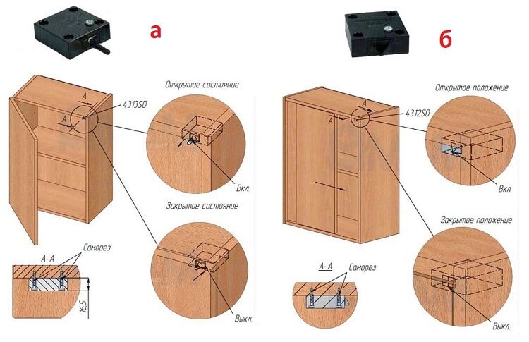 В случае установки концевого выключателя для распашной двери, его фиксируют при помощи саморезов внутри шкафа. В закрытом состоянии дверь прижимает кнопку, размыкает цепь и освещение не работает. В открытом — дверь отпускает кнопку и включается освещение.