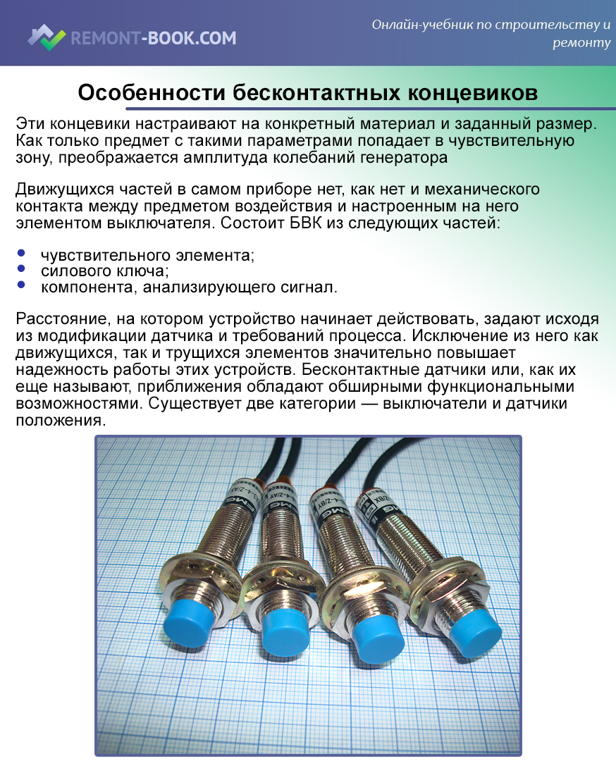 Бесконтактные КВ созданы для использования в механизмах, где непосредственный контакт с движущимися элементами по каким-либо причинам невозможен. В отличие от механических устройств, бесконтактные модели представляют собой датчики, улавливающие сигнал контрольного участка движущегося элемента. Существует несколько конструкций бесконтактных концевиков, отличающихся принципом действия.