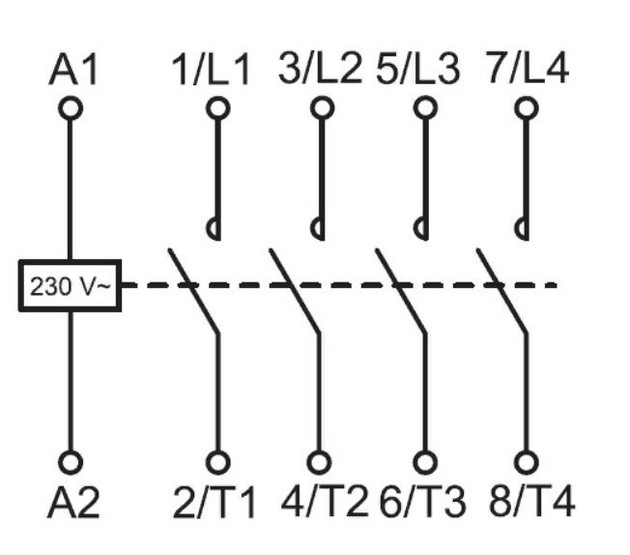 Для тех, кто мало-мальски знаком с электротехникой, понять принцип работы несложно. Основа силовой группы — это контакты, обозначенные на схеме литерами «L» и «T». В зависимости от конструкции, система может одновременно включать одну, две, или более пар контактов. Для того чтобы соединительная проводящая планка прижалась к неподвижным контактам, требуется усилие. В обычных включателях это механическое приспособление, приводимое в движение оператором. Наша схема срабатывает с помощью электромагнита. Когда на катушку A1-A2 подается управляющее напряжение, соленоид втягивается, и силовые (рабочие) контакты замыкаются.