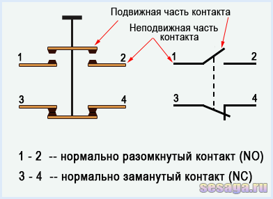 Нормально замкнутый (NC) контакт в нерабочем состоянии всегда замкнут и через него может проходить ток. На рисунке такой контакт обозначен парой 3–4, и чтобы прекратить прохождение тока через него, надо контакт разомкнуть.