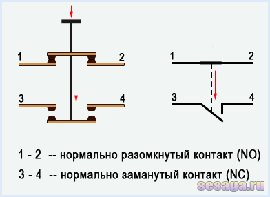 Теперь, если нажать кнопку, то нормально разомкнутый контакт 1-2 замкнется, а нормально замкнутый 3-4 разомкнется. О чем показывает рисунок ниже.