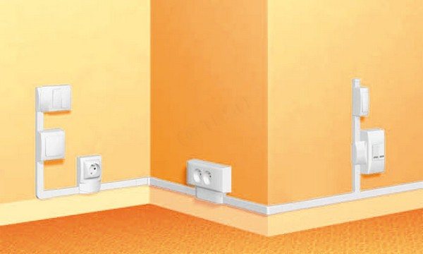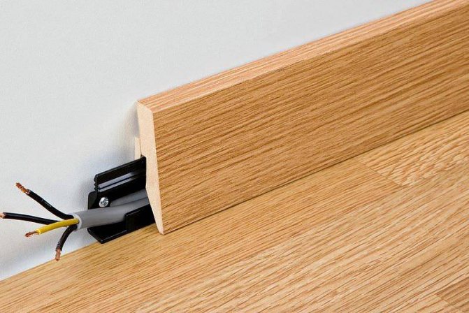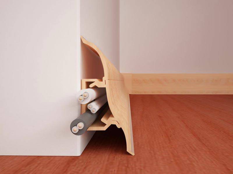 Использование кабель-каналов в виде плинтуса, позволяет избежать дополнительных элементов, монтируемых по поверхности стен. В этом случае провода укладываются внутри плинтуса, который прикрывает стык между поверхностью стены и полом.