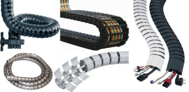Такие каналы называют ещё траковыми из-за внешнего вида, напоминающего гусеницу танка. Основное предназначение таких изделий заключается в обеспечении питанием подвижных элементов электрической цепи. Существуют также гибкие каналы в виде гофрированной трубки из ПВХ. Применяется она в основном на промышленных объектах. Разнообразный диаметр изделий позволяет проложить кабели нескольких сечений. Материалом производства для гибких лотков является негорючий пластик.