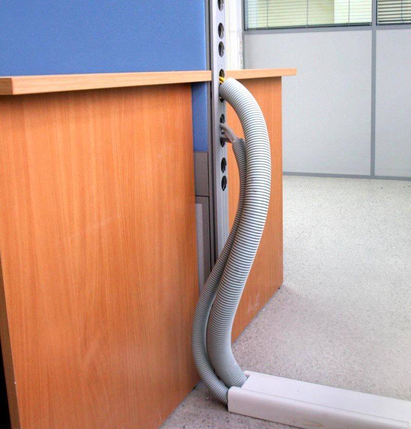 Тут автор проекта применил слишком высокий напольный короб, который создает значительные препятствия свободному передвижению персонала и посетителей в офисе. Гофрированные кабель-каналы круглые для электропроводки выглядят в таком исполнении чужеродными элементами. Они не обеспечивают надежную фиксацию кабельных изделий, что подразумевает возможность случайных повреждений.