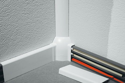 - Плинтусные. Эти конструкции применяют в местах стыков стен и пола. Для монтажа конструкций разных форм производители выпускают дополнительные устройства – отводы, заглушки, внешние и внутренние углы и другие элементы. Кабель каналы плинтусного типа удачно вписываются в интерьер большинства домов и квартир.