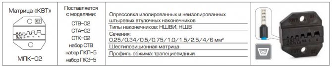 Еще в набор входит матрица МПК-01 для изолированных коннекторов марки НКИ, НВИ и им подобных. Она рассчитана на сечения от 0,5 до 6мм2.