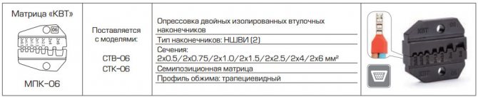 Для опрессовки двойных втулочных наконечников марки НШВИ-2 нужно воспользоваться матрицей МПК-06. Она имеет 7 позиций и обжимает наконечники от 0,5 до 6мм2.