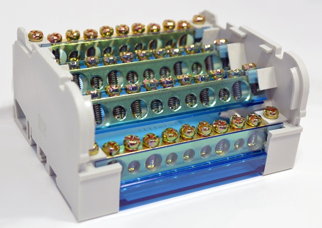Модульный распределительный блок состоит из нескольких распределительных шин, которые изолированы друг от друга. Количество шин может быть достаточно разнообразным и все будет зависеть от модели устройства. Шины могут изготавливаться из меди или латуни. Также в конструкцию этой системы будут входить винтовые зажимы, которые в дальнейшем позволяют осуществлять быструю коммутацию проводов различного сечения.