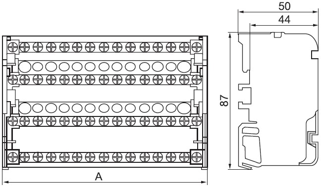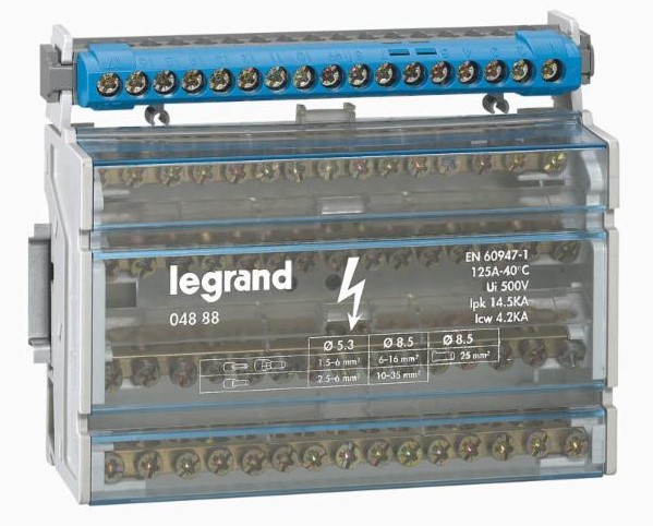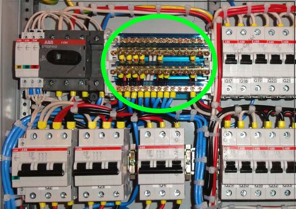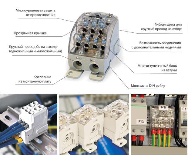 Трехфазный блок комплектуется 4 металлическими шинами для подсоединения нулевого провода и трех силовых фаз А, В, С. Число выходящих соединений может быть от 7 до 15. Выходящие провода могут использоваться как однофазные для освещения и розеток, так и трехфазные для подключения промышленных двигателей.