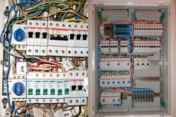 - аккуратность монтажа, чтобы было понятней, ниже приведено фото, на котором изображены распределительные щиты с применением кросс-модулей и без. Обозначать каждый из них нет необходимости, разница наглядно видна.